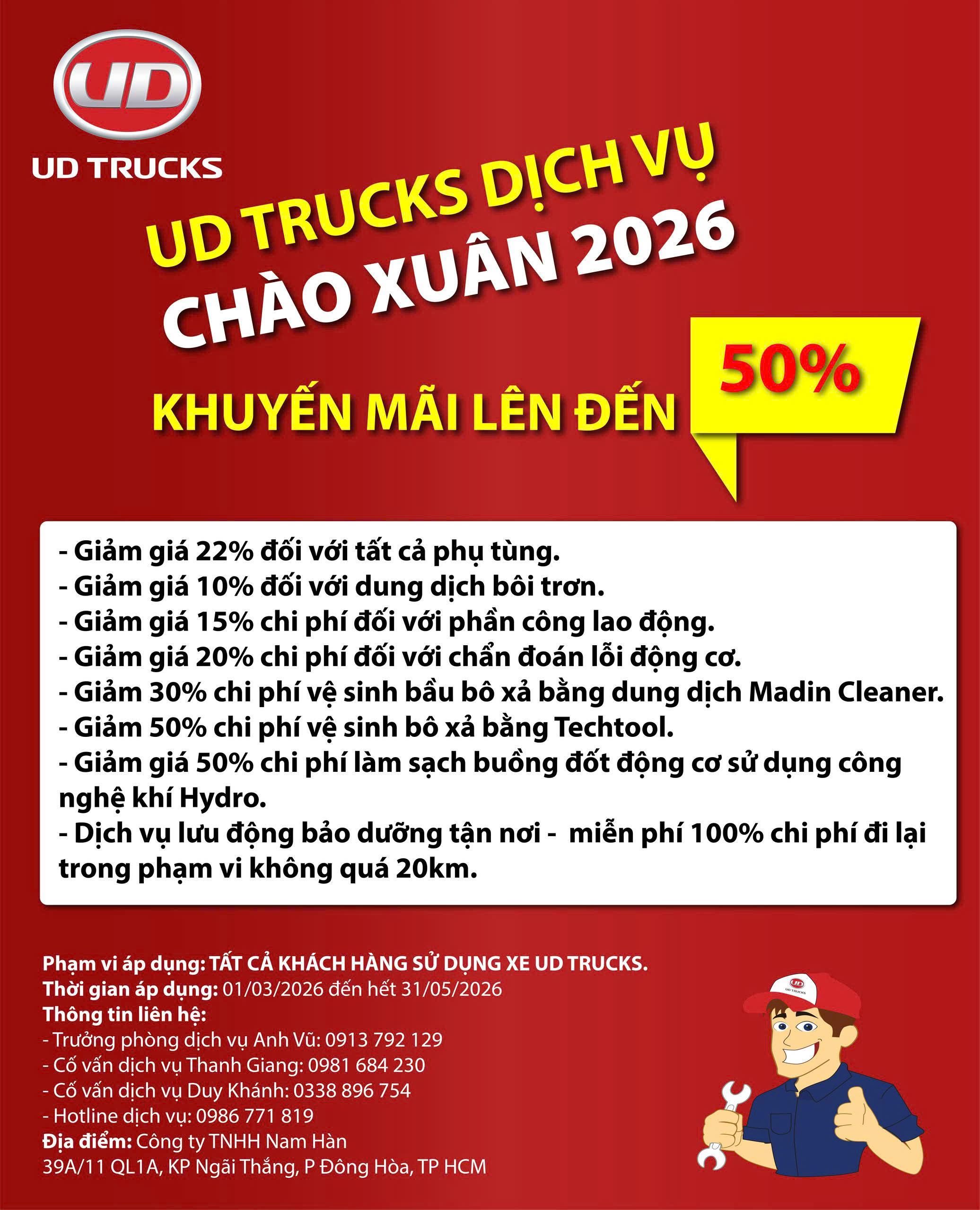 - Phụ tùng thay thế được bảo hành 02 năm nếu được thay thế tại hãng UD.